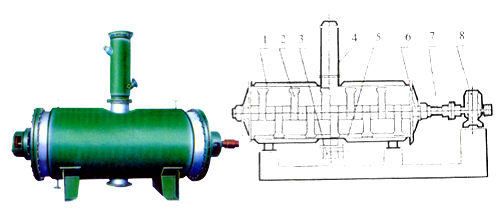 具有結構簡單,操作方便,使用周期長,性能穩(wěn)定可靠,蒸汽耗量小,適用性能強,產(chǎn)品質(zhì)量好,適用于不耐高溫、易燃、調(diào)溫下易氧化的膏狀物料的干燥,該機經(jīng)用戶長期使用證明是一良好的干燥設備。原理:被干燥物料從殼體上方正中間加入,在不斷正反轉(zhuǎn)動的耙齒的攪拌下,物料軸向來回走動,與殼體內(nèi)壁接觸的表面不斷新,受到蒸汽的間接加熱,耙齒的均勻攪拌,粉碎棒的粉碎,使物料表面水分有利的排出,氣化的水分經(jīng)干式除塵器、濕式除塵器、冷凝器,從真空泵出口處放空。結構:真空耙式干燥機的主要部件。